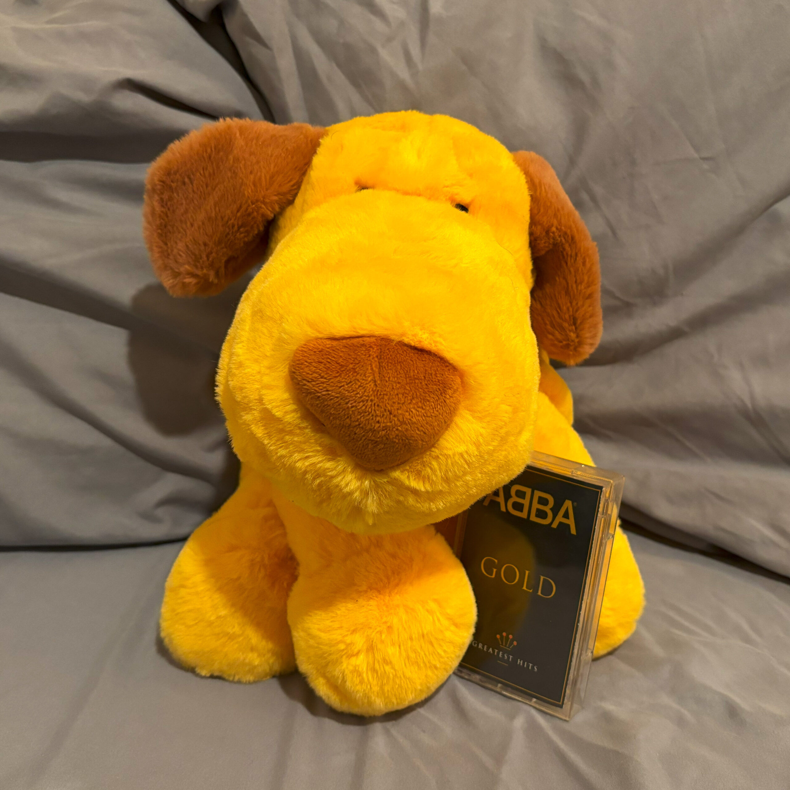 Abba's Greatest Hits cassette tape, Gold, paired with Abby the yellow dog.